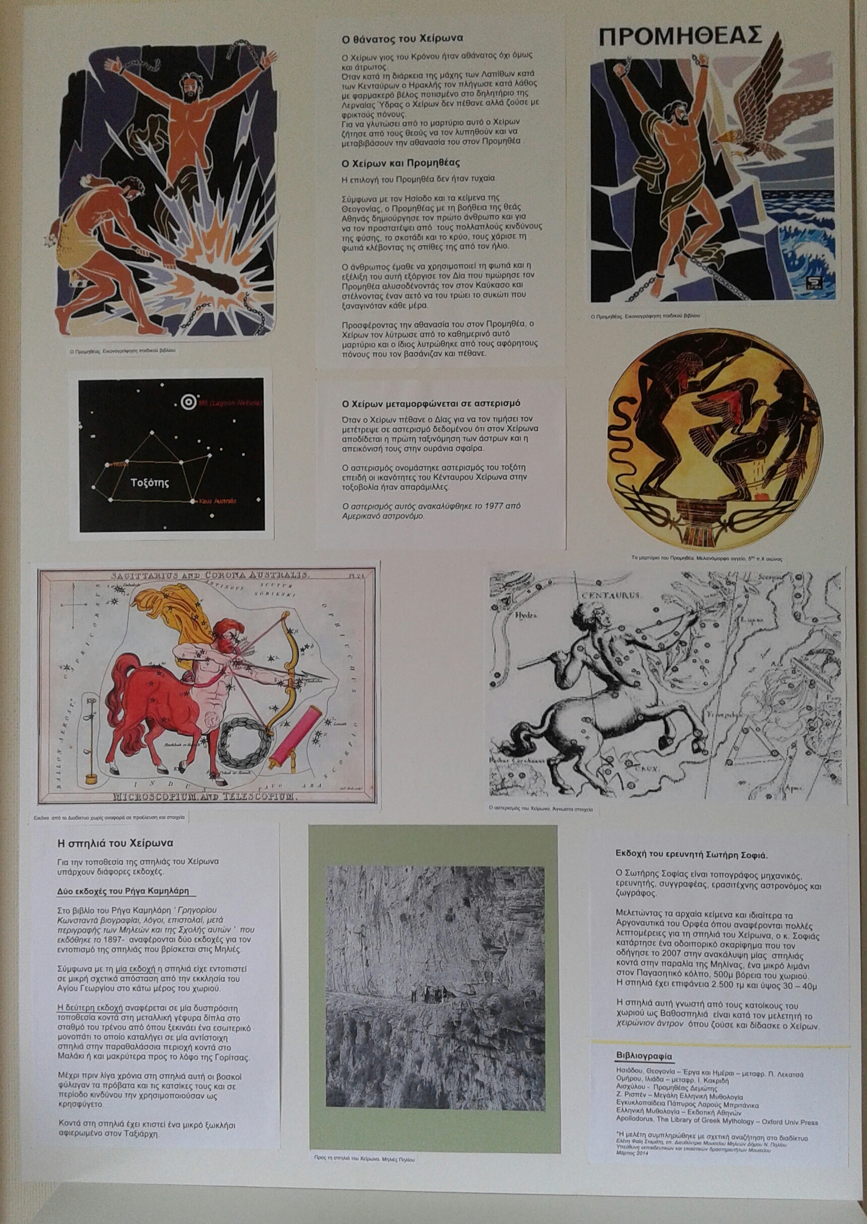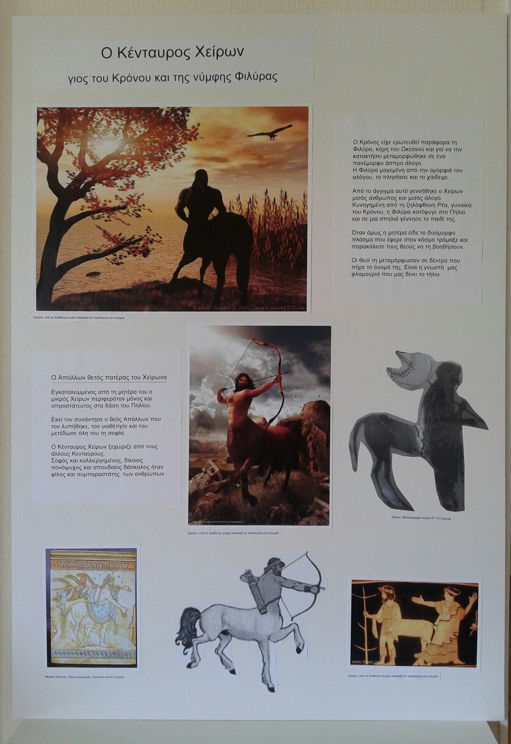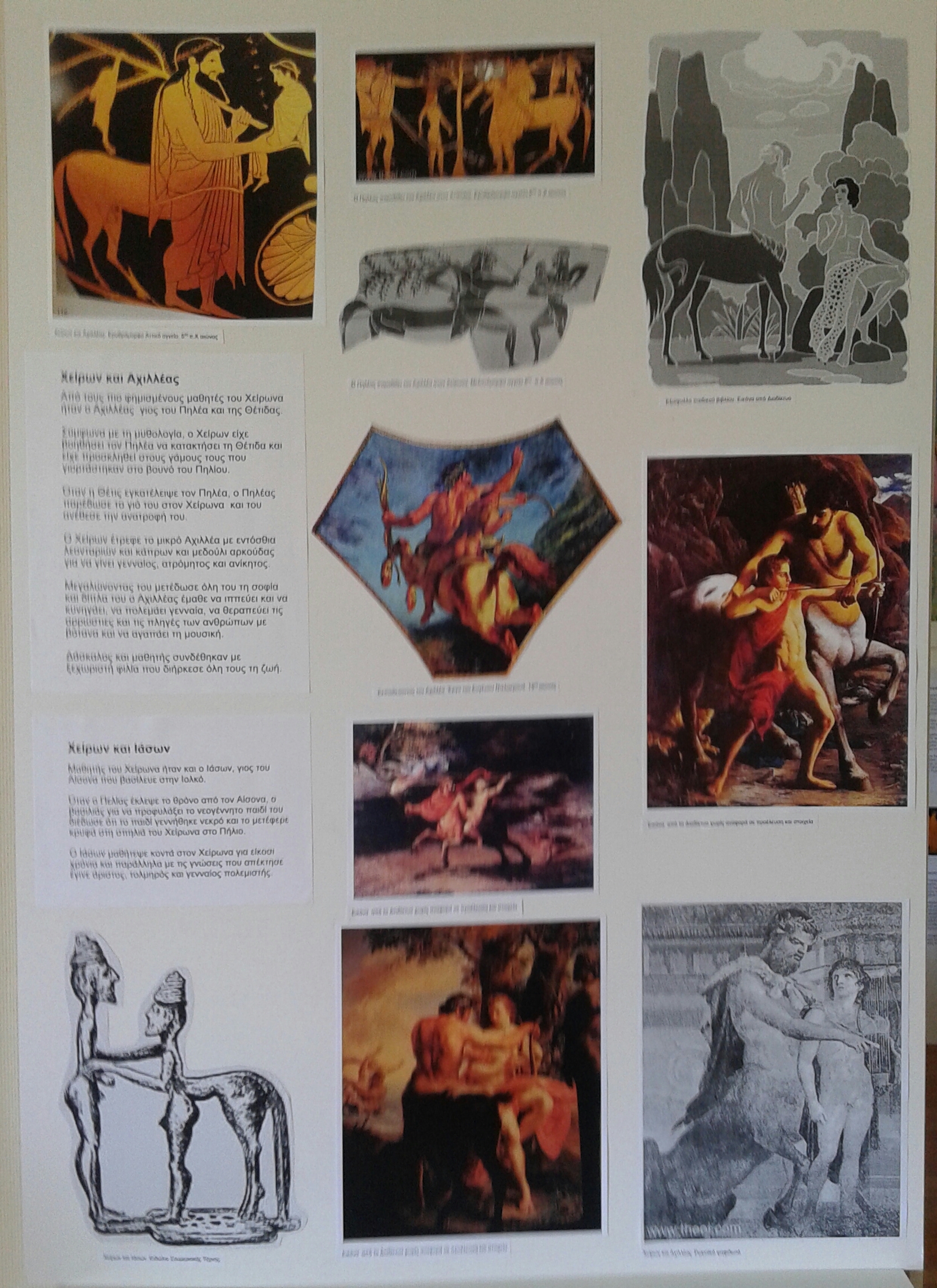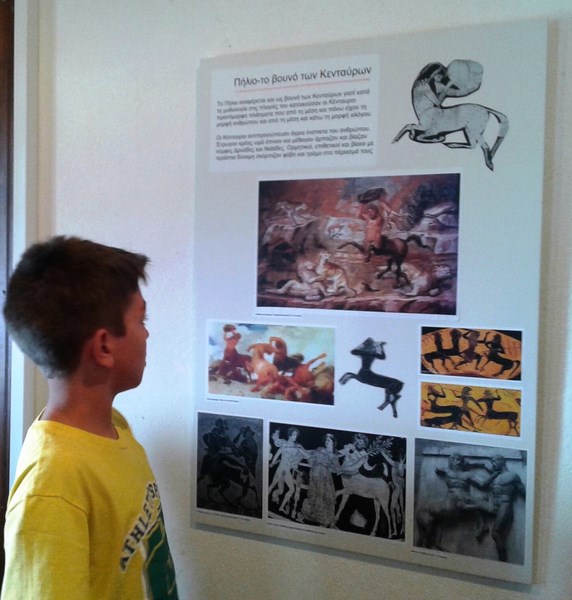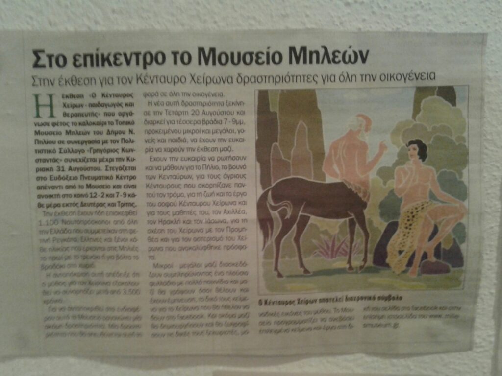 The exhibition presented the centaur Chiron as an educator, a healer, friend of the people. Using texts and photographs from ancient Greek vases, frescoes and mosaics, paintings and sculptures, the exhibition referred to the birth of Chiron from the union of Saturn and Philyra, it gave information about the teaching of Achilles, Jason and Orpheus, it told about his learning from the god of medicine how to heal with the many herbs of mount Pelion and finally it told of his tragic end with Prometheus.